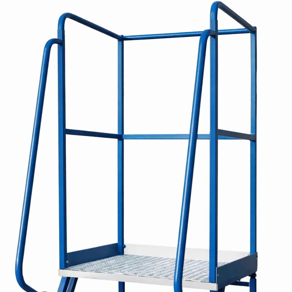 Bezpieczeństwo: antypoślizgowe stopnie eliminują ryzyko poślizgnięcia się podczas wchodzenia lub schodzenia z drabiny magazynowej a solidne i wygodne poręcze dodatkowo umożliwiają pewne i stabilne podparcie dla użytkownika. Dźwignia blokująca skutecznie zapobiega przypadkowemu przesunięciu się pomostu podczas pracy. Tabliczka znamionowa umieszczona na drabinie, instrukcja obsługi i również deklaracja zgodności dostarczane wraz z produktem dokładnie określają, jak bezpiecznie korzystać z podestu i jakie środki ostrożności są zalecane.